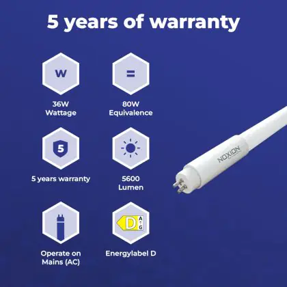 Bei der LEDtube T5 Extreme (Mains AC) High Output 36W 5600lm - 840 Kaltweiß | 145cm - Ersatz Für 80W handelt es sich um eine energieeffiziente LED-Röhre. Sie ersetzt Ihre konventionelle Leuchtstoffröhre mit 80W. Die Röhre ist 1449 mm lang und hat die Farbtemperatur . Die durchschnittliche Lebensdauer der LED-Röhre beläuft sich auf 50000 Stunden. Wir bieten Ihnen für dieses Produkt eine Garantie von 5 Jahre an.