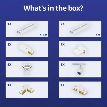 | Nom du fabricant | Complete L shaped 1-Phase Track Set White incl. 8x Spot fixture + GU10 2700K 3W Dim – 1.5 x 2 meters | |