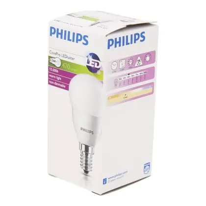 Cette ampoule Philips Corepro LED Lustre E14 Boule Dépolie 5W 470lm - 827 Blanc Très Chaud | Équivalent 40W avec son efficacité lumineuse de lumen par watt vous permettra de profiter d’un éclairage de qualité. Avec sa durée de vie de 15000 heures, vous n’aurez pas à vous soucier de son remplacement avant quelques années.